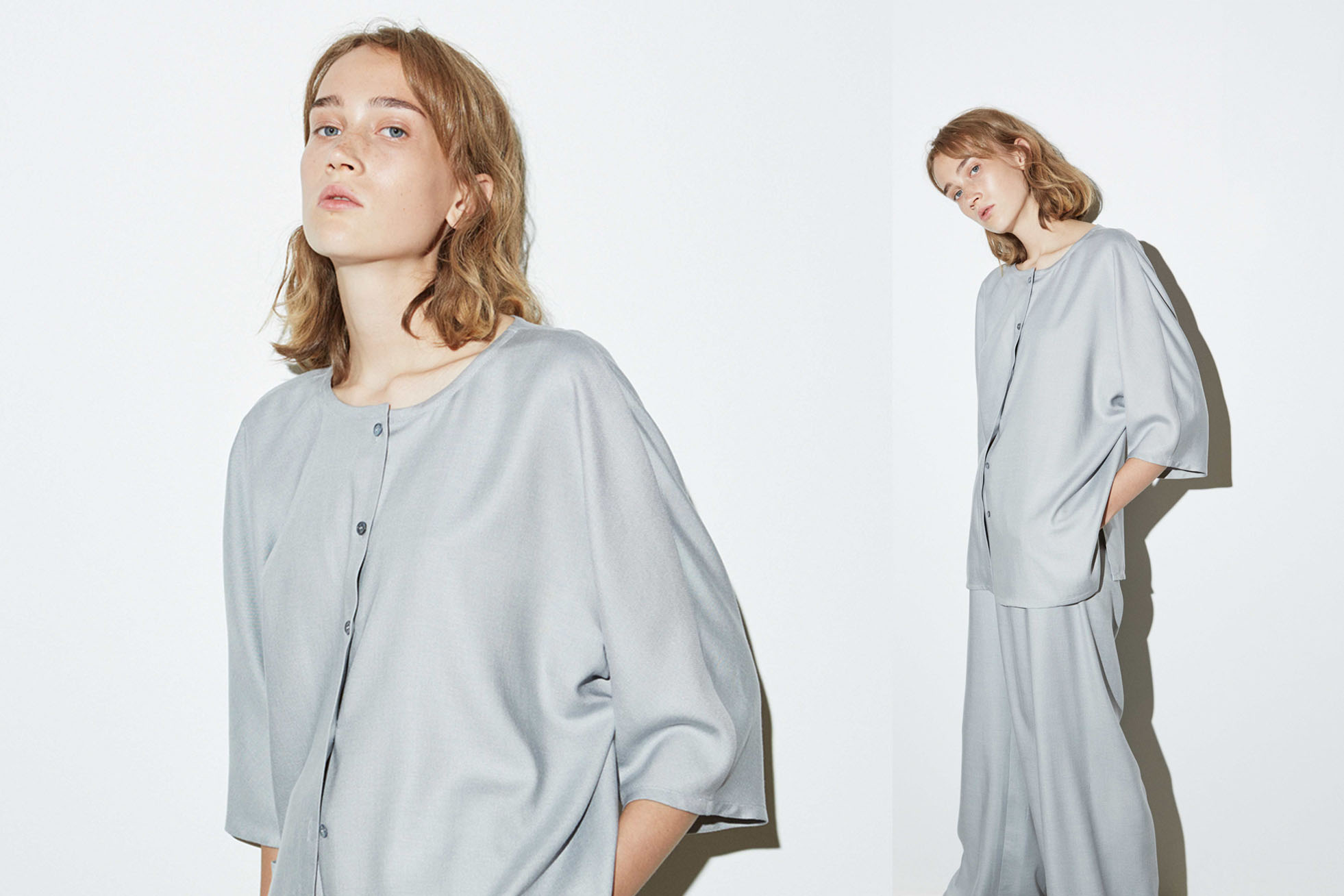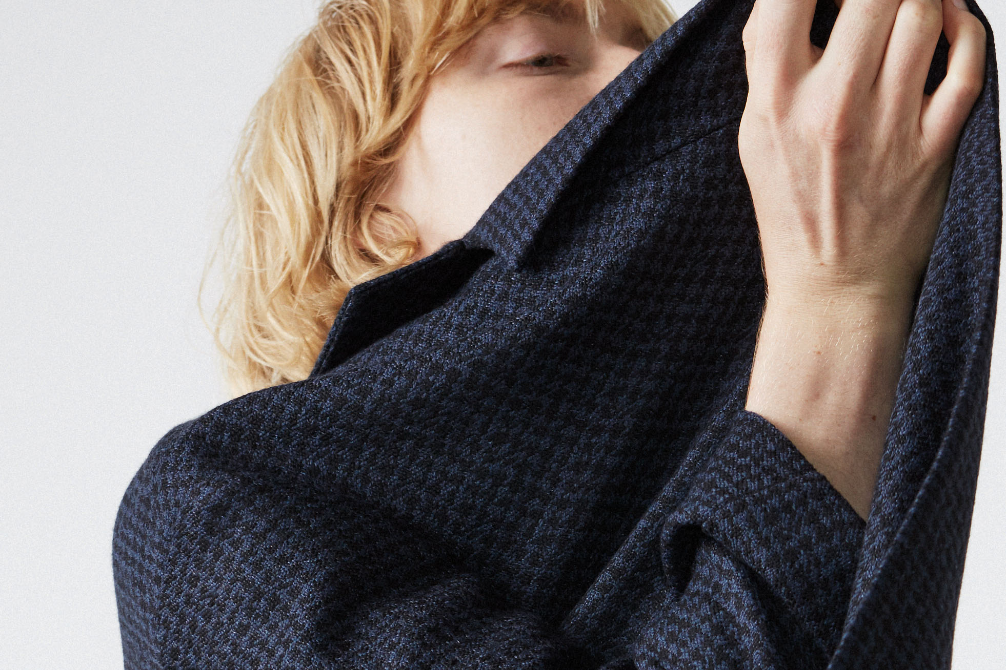 The SS19 collection humbly flows from the studio, as a study of movement, form and function. Loose billowing houndstooth silk woollen overcoats are donned over languid poplin shirt-dresses, fitted cropped pants are paired with oversized cashmere tunics and lightweight dresses appear alongside deconstructed blazers and fine merino roll-necks. In terms of the fabrics, the finest pure silk, cashmere, linen, merino and cotton have been picked, in order to create timeless pieces that will last a lifetime. An understated palette of greys, off-white, black, deep navy, bright blue and brown, mimics the summery foliage of the Estonian forest.