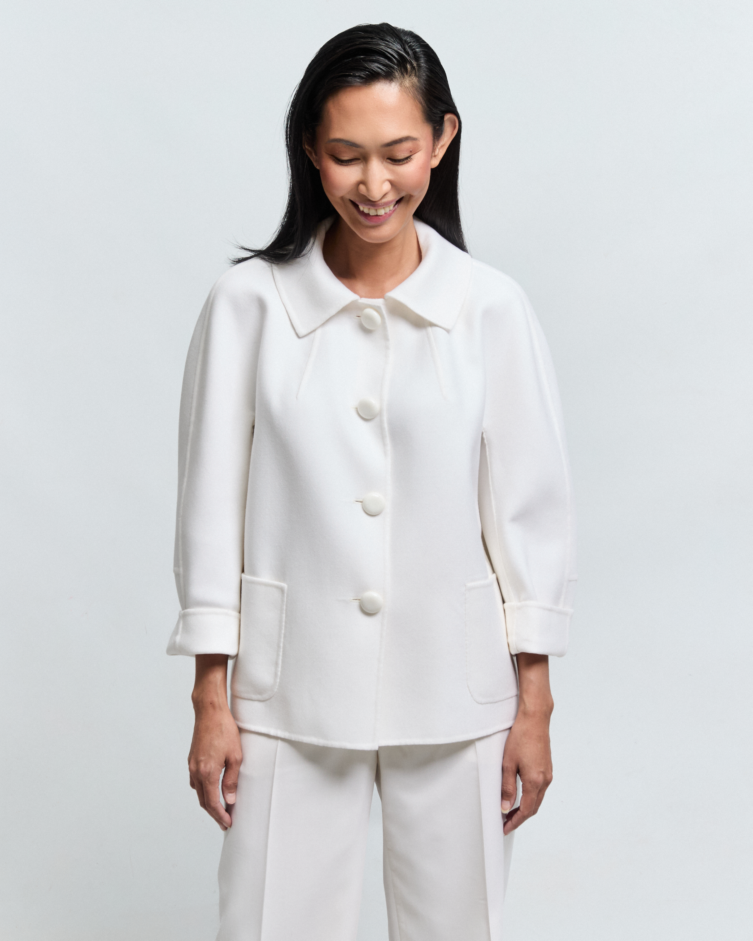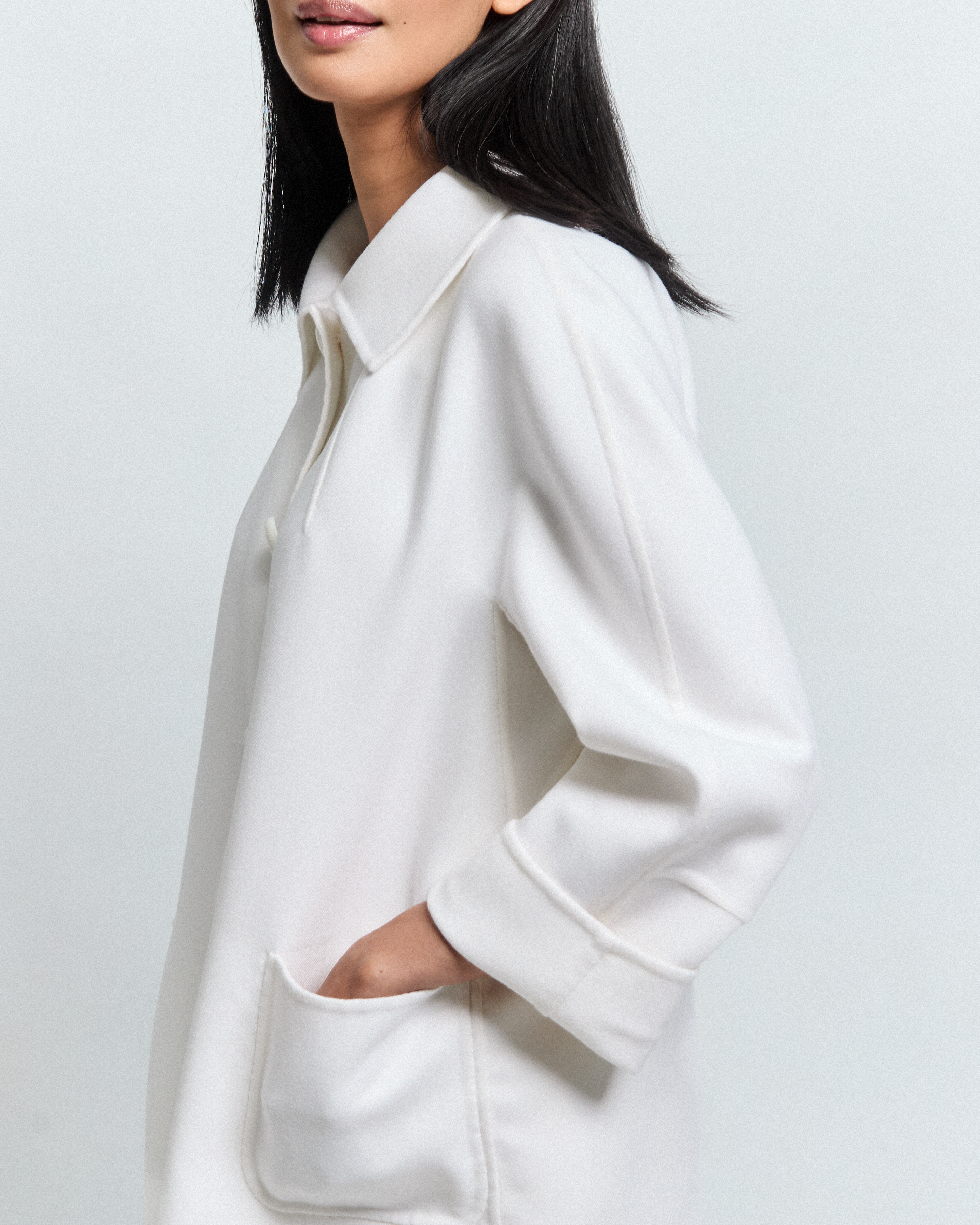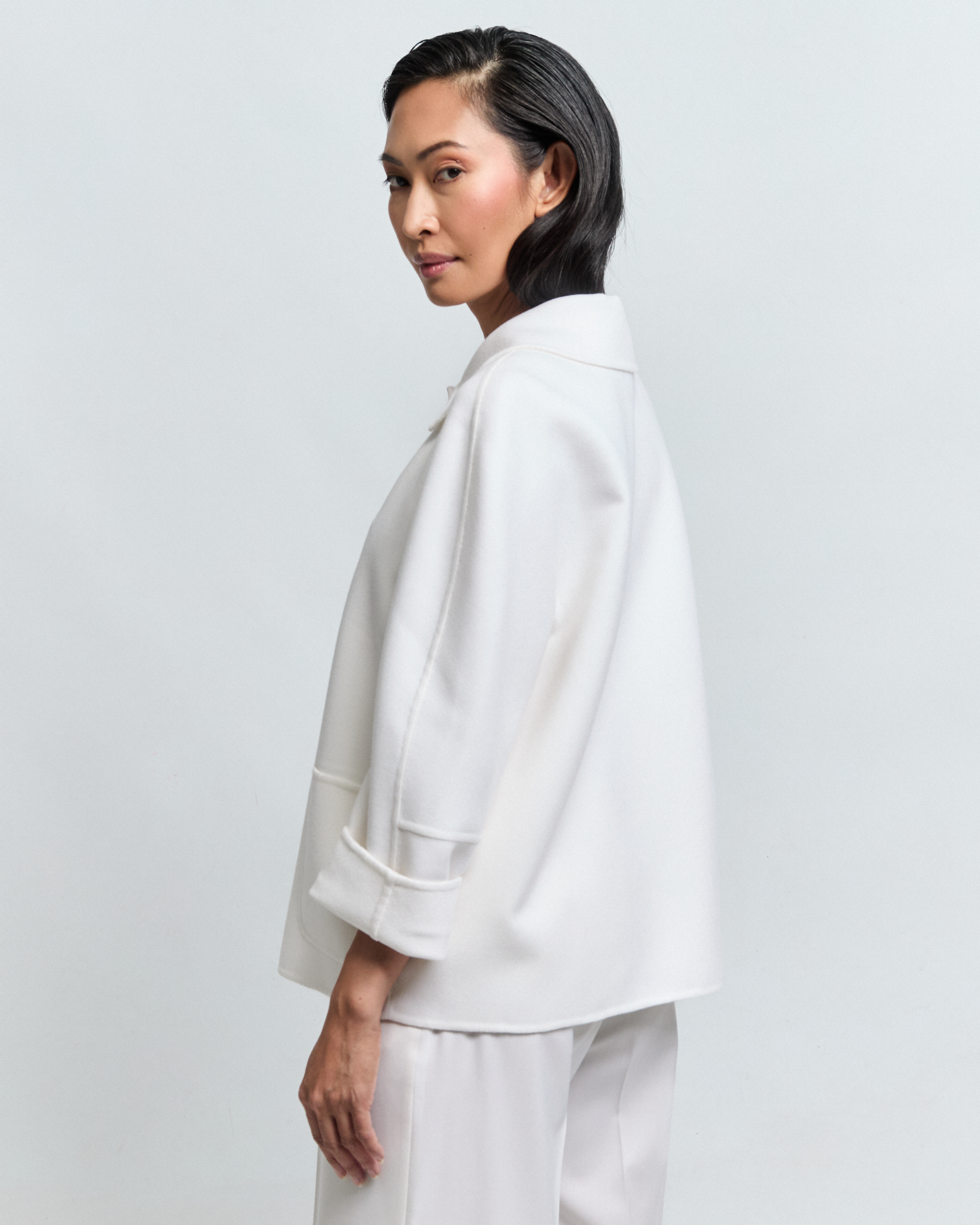 There is something quietly authoritative about CORIN. Inspired by the Kennedy-era tailoring of the 1960s, it carries that same sense of ease without effort, a jacket that looks considered without trying. Cut in a kimono silhouette with a lower sleeve panel and a ¾ length sleeve, it fastens with three buttons at the front and finishes with a boucle collar at the neck.