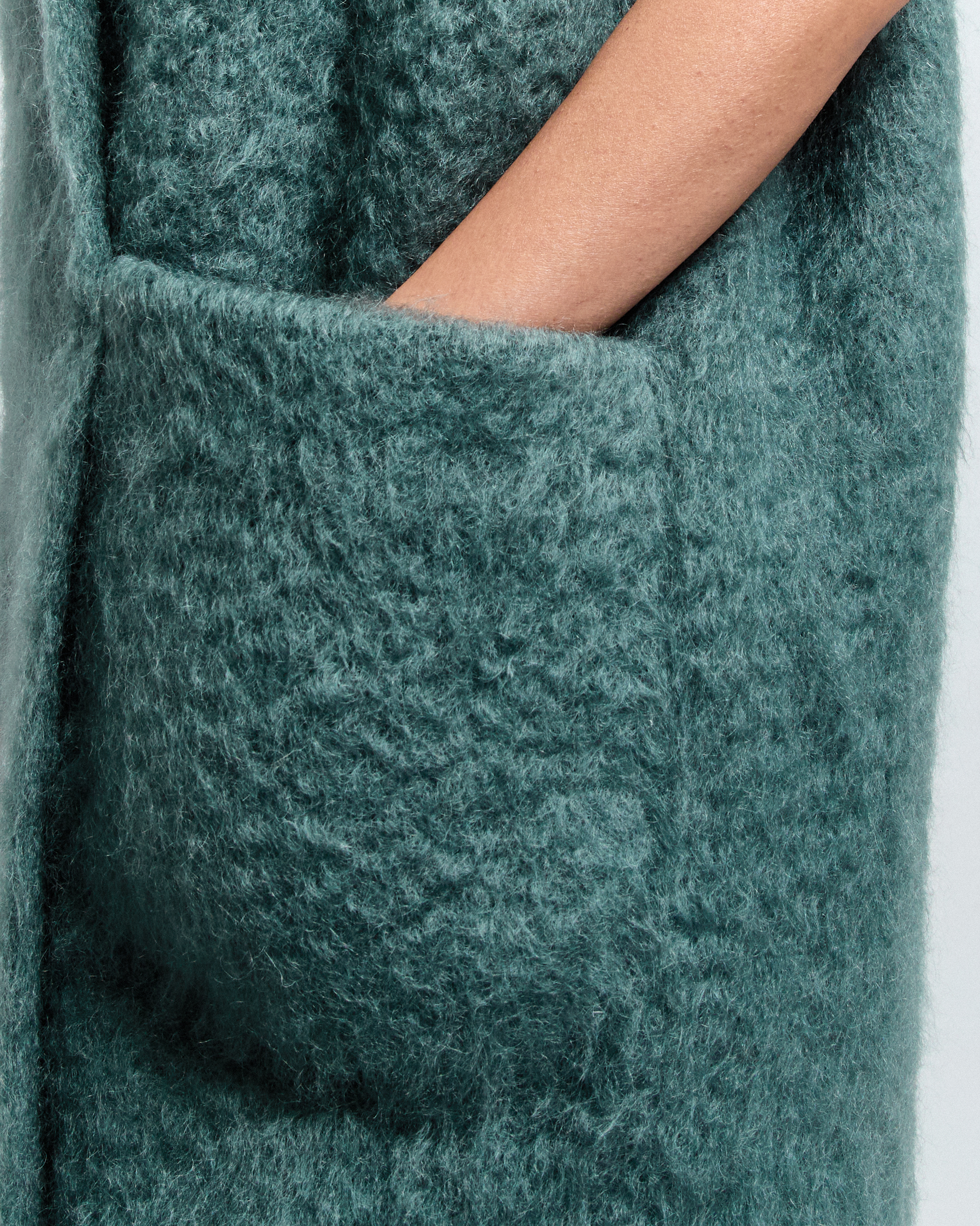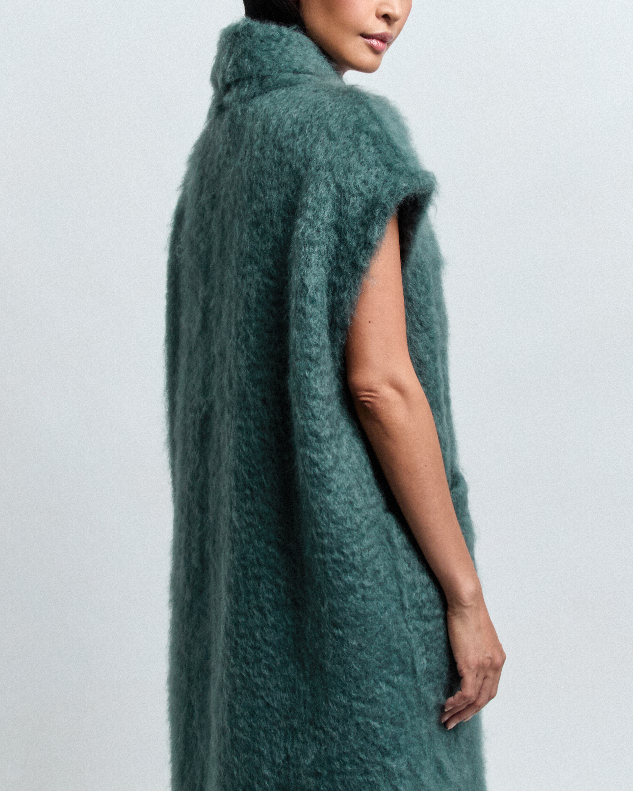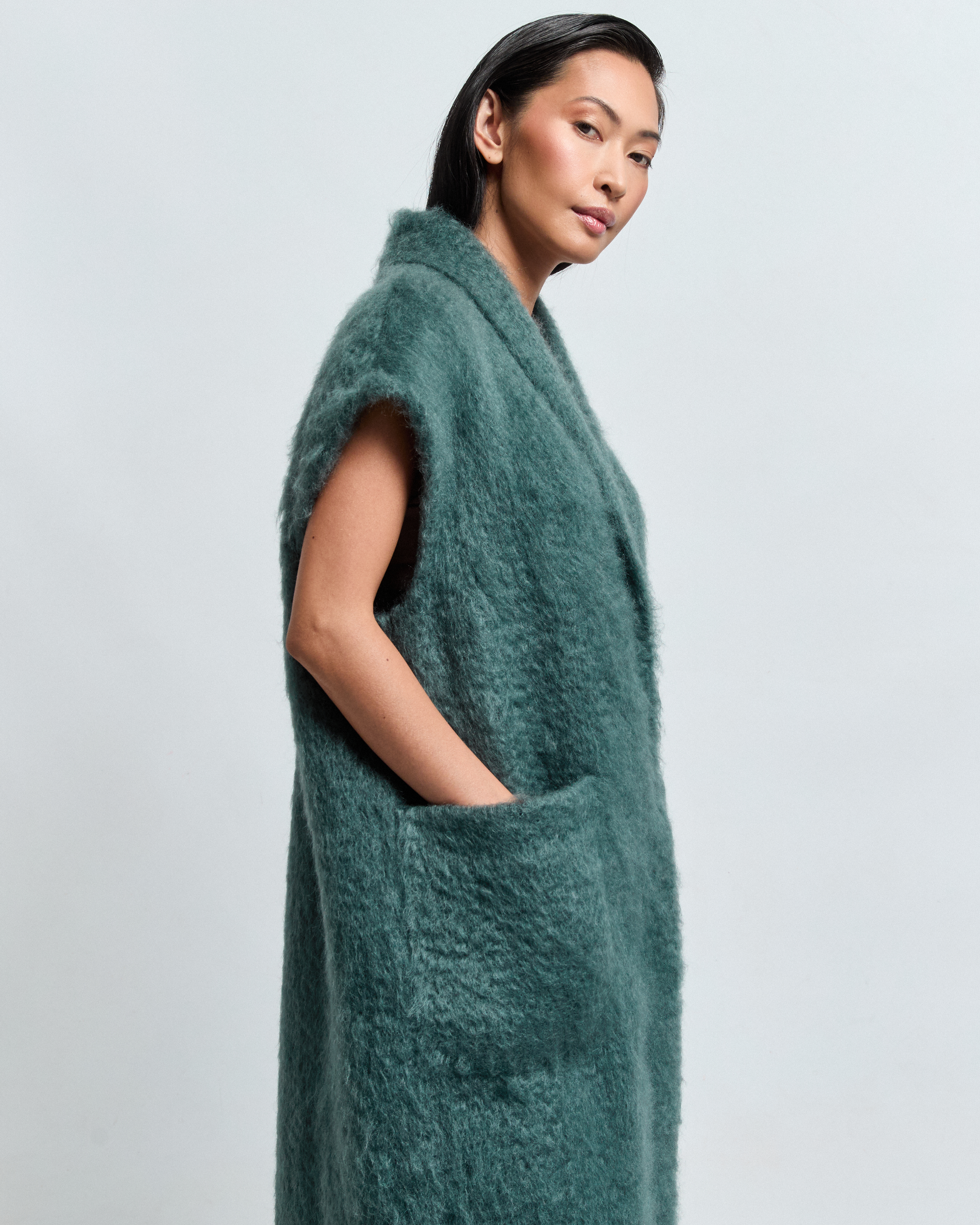 A long vest in mohair, cut straight with a small shawl collar and a short kimono sleeve. Two generously sized patch pockets. MARA layers without bulk — the kind of piece that makes everything underneath look more intentional.